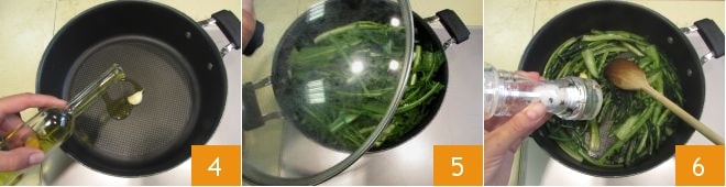Dans une poêle, faites revenir une gousse d'ail en chemise avec un filet d'huile 4, puis ajoutez la chicorée, couvrez avec le couvercle 5 et faites cuire à feu moyen pendant 8 minutes. Assaisonnez la chicorée de sel 6 et de poivre et laissez refroidir.