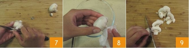 Occupez-vous maintenant des champignons : avec un petit couteau, éliminez l'extrémité du pied et pelez la partie extérieure du chapeau 7, puis frottez délicatement les champignons avec une feuille de papier absorbant humidifiée pour éliminer les résidus de terre 8 et coupez-les en fines tranches 9.