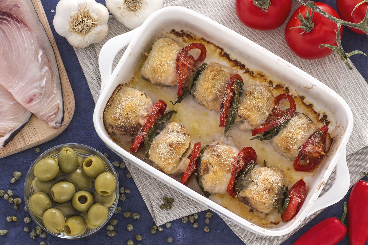 Les rouleaux d'espadon sont un plat d'été typique de la tradition sicilienne, en particulier de Catane. Les rouleaux d'espadon sont préparés avec de fines tranches d'espadon et une garniture d'ingrédients simples mais très savoureux comme des câpres, des olives, de la chapelure et des tomates. Les rouleaux d'espadon se marient très bien avec de nombreux accompagnements. Un exemple ? Les Poivrons au four avec des câpres ou les célèbresCourgettes à la scapece! Ces délicieux petits morceaux, également appelés braciolettini dans certaines localités, sont un plat très répandu, il existe donc plusieurs variantes de la recette, dans certains cas, on utilise pour la garniture du pecorino et des pignons de pin.