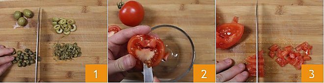 Pour préparer les rouleaux d'espadon, commencez par préparer la garniture : hachez les olives et les câpres avec un couteau 1, coupez les tomates en deux, enlevez les graines et coupez-les en dés 3.