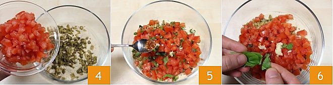 Dans un bol, mélangez la chapelure, les câpres, les olives hachées, la gousse d'ail émincée et les tomates 4, une demi-cuillère à café de piment 5, le basilic frais 6,