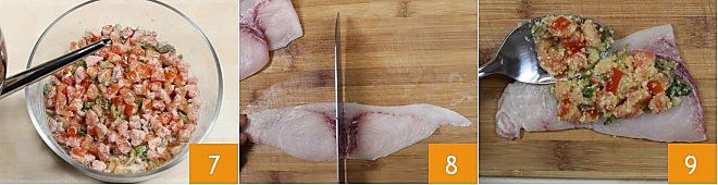 salez et assaisonnez avec un filet d'huile 7. Ensuite, préparez l'espadon : coupez les tranches de poisson en deux 8, garnissez chaque tranche avec la garniture 9, environ 16 gr de mélange,