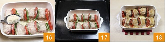 Coupez une tomate en tranches 13 et réservez-les, huilez un plat allant au four, disposez les rouleaux à l'intérieur 14 et embrochez une tranche de tomate et une feuille de basilic d'un côté 15, continuez ainsi avec le reste des morceaux ;