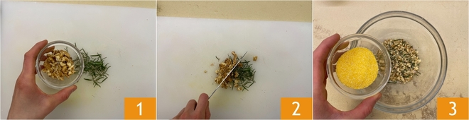 Pour préparer les rouleaux d'oignons nouveaux, commencez par la panure : disposez les noix et le romarin sur une planche 1 et hachez-les finement 2. Versez dans un bol le mélange obtenu et la farine de maïs 3.