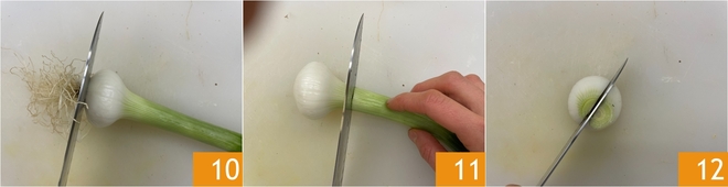 Nettoyez les oignons nouveaux en enlevant la partie extérieure la plus dure, coupez les deux extrémités 10 11 et fendez-les en deux dans le sens de la longueur 12.