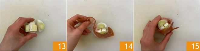 Garnissez les oignons nouveaux en déposant un morceau de brie au centre d'une moitié 13, puis refermez avec l'autre moitié pour enfermer le fromage. Enroulez chaque oignon garni d'une tranche de speck 14, en la faisant bien adhérer 15.