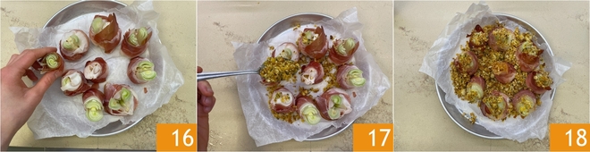 Disposez les rouleaux sur une plaque recouverte de papier sulfurisé 16, légèrement espacés. Répartissez ensuite la panure sur la surface 17 et terminez par un filet d'huile. Faites cuire dans un four ventilé préchauffé à 180C pendant 15-20 minutes, jusqu'à ce que le speck soit doré et la panure bien croustillante. Sortez du four 18 et servez les rouleaux d'oignons nouveaux bien chauds, pour profiter pleinement du cœur fondant de brie.