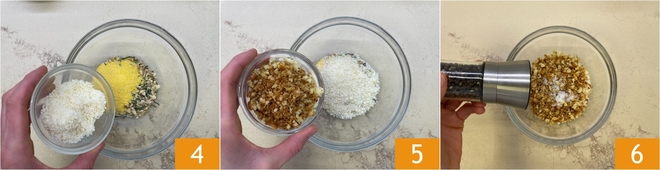 Ajoutez le Parmesan râpé 4 et la chapelure rustique 5 ; puis rectifiez l'assaisonnement avec du sel et du poivre 6.