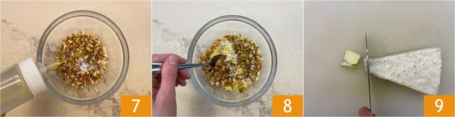 Ajoutez un filet d'huile d'olive extra vierge 7 et mélangez jusqu'à obtenir une texture sableuse 8. Coupez ensuite le brie en morceaux 9.