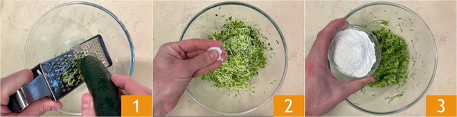 Pour préparer les roulés de courgettes à la ricotta et tomates séchées, commencez par laver et équeuter les courgettes, puis râpez-les dans un bol 1. Salez 2, mélangez et laissez reposer pendant 10 minutes, couvertes de film plastique. Après ce temps, les courgettes auront libéré une partie de leur jus, ce qui sera nécessaire pour obtenir la bonne consistance de la pâte. Puis versez la farine 3.