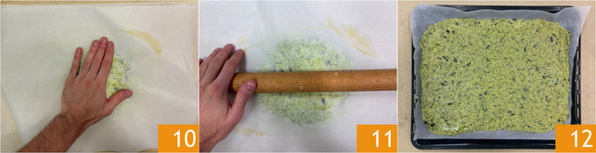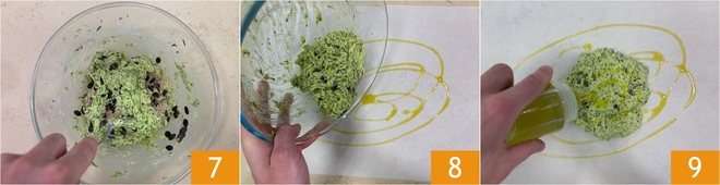 Mélangez le tout 7 pour former une pâte homogène. Versez la pâte sur une feuille de papier sulfurisé légèrement huilée 8, puis huilez également la surface 9.