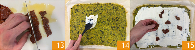 Entre-temps, coupez les tomates séchées en petits morceaux 13. Une fois que la pâte est refroidie, étalez la ricotta sur toute la surface 14, puis ajoutez les tomates séchées 15.