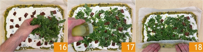 Enfin, répartissez la roquette préalablement lavée et séchée 16. Assaisonnez avec une pincée de sel et un filet d'huile 17. Roulez délicatement la pâte du côté long en vous aidant du papier sulfurisé 18.