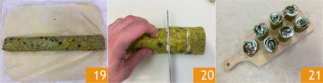 Lorsque vous avez obtenu un rouleau compact 19, coupez-le en tranches de 3-4 cm d'épaisseur 20. Vos roulés de courgettes à la ricotta et tomates séchées sont prêts à être servis 21 !