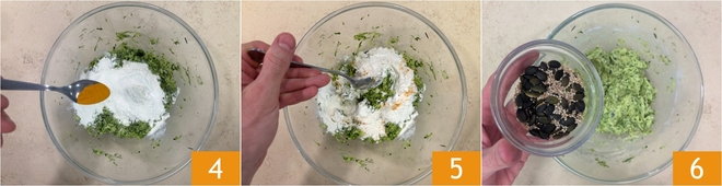 Ajoutez également le curcuma 4 et mélangez bien 5, puis incorporez les graines 6.