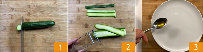 Pour préparer les roulés de courgettes, commencez par couper les extrémités des courgettes 1. Ensuite, tranchez-les finement à l'aide d'un économe, en coupant dans le sens de la longueur 2. Préparez l'huile et la chapelure rustique dans deux assiettes 3.