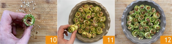 Une fois tous les roulés préparés 10, disposez-les dans un plat de manière à ce qu'ils se soutiennent entre eux 11. Faites cuire au four statique à 200°C pendant 15 minutes. Vos roulés de courgettes sont prêts à être servis 12