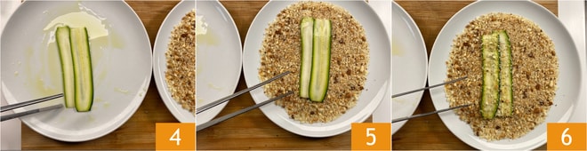 Joignez deux tranches de courgettes et passez-les d'abord dans l'huile 4 puis dans la chapelure de chaque côté 5 6.