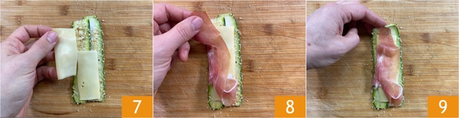 Garnissez-les de fontina 7 et de jambon cru 8. Enroulez-les délicatement pour ne pas perdre la panure 9.
