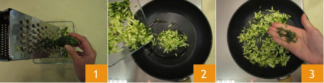 Pour préparer les roulés feuilletés aux courgettes et jambon, commencez par laver et sécher les courgettes. Coupez les extrémités et râpez-les avec une grille à gros trous 1. Chauffez une poêle avec un filet d'huile et ajoutez les courgettes 2, assaisonnez avec du sel, du poivre et du thym, et laissez cuire pendant 5 minutes à feu moyen. Elles doivent être bien sèches 3.
