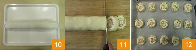 et fermez bien aussi les côtés 10. Transférez au réfrigérateur pendant au moins 2 heures pour qu'il soit plus facile de couper les roulés. Une fois le temps écoulé, coupez des roulés d'environ 2 cm obtenant ainsi 12 pièces égales 11. Placez-les sur une plaque de cuisson avec du papier sulfurisé 12