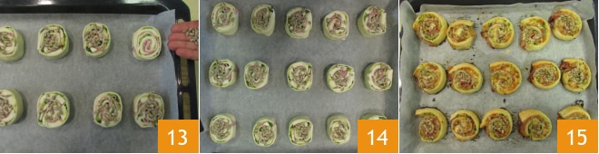 et décorez la surface avec des graines de tournesol 13. Bien, vous êtes prêts pour la cuisson 14 : les roulés feuilletés aux courgettes et jambon cuisent au four statique, déjà chaud à 200°, pendant environ 20-25 minutes 15.