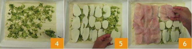 Laissez refroidir complètement les courgettes, puis déroulez la pâte feuilletée. Couvrez la surface avec les courgettes, en laissant 1 cm des bords 4. Continuez à garnir la pâte avec les tranches de provolone 5 et enfin le jambon cuit 6.