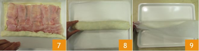 Maintenant, enroulez la pâte feuilletée garnie très délicatement en vous aidant avec le papier sulfurisé, faites attention à ne pas l'envelopper à l'intérieur ; enroulez bien serré 7. Une fois le rouleau obtenu 8, enveloppez-le avec la feuille de papier sulfurisé 9.