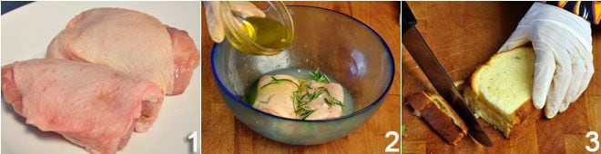 Pour préparer les rustichelle de poulet en croûte de pain brioché, on procède à la marinade des hauts de cuisse 1. Il suffit de mélanger tous les ingrédients de la marinade, d'immerger les hauts de cuisse 2, de couvrir avec du film alimentaire et de laisser au frigo pendant une heure, en retournant de temps en temps. Pour la panure, on procède à éliminer les bords et râper 4 le pain brioché (si on veut, on peut utiliser le mixeur) et ajouter le reste des ingrédients.