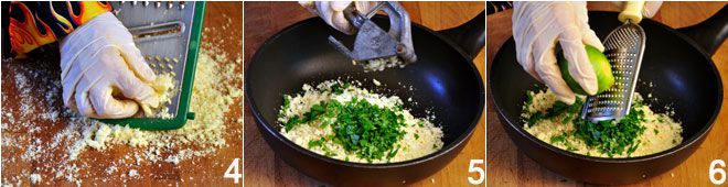 Pour la panure, il est bien de faire une distinction en fonction du type de cuisson. Si l'on utilise une plaque de cuisson, on va griller dans la poêle la panure faite de pain brioché émietté, de persil haché, d'ail écrasé 5, de zeste de citron vert râpé 6 et d'huile 7 et on y passera le poulet seulement après l'avoir cuit.