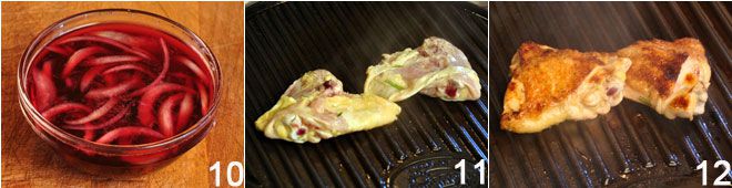 Pendant que le poulet marine au frigo, on prépare la salade. On coupe les pommes en julienne et la laitue iceberg de la même taille 8, on ajoute la sauce dijonnaise 9 que vous préparez en dissolvant le sucre dans le jus de lime et ensuite en ajoutant la moutarde de Dijon, la moutarde à l'ancienne, la mayonnaise et en mélangeant. On laisse mariner au frigo. Le sel sera ajouté seulement à la fin pour éviter que la laitue libère beaucoup de son eau. Couper l'oignon de Tropea et le mettre, en le remuant bien avec un peu de sel, dans un récipient pour mariner avec le vinaigre et le vin rouge 10. Vingt minutes suffiront.