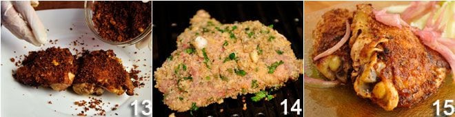 Si l'on a cuit le poulet sur la plaque, effectuer la panure 13 et dresser en ajoutant la salade de pommes en accompagnement en la surmontant de quelques filaments d'oignon mariné. Si l'on utilise un barbecue classique, il est bon de préparer la panure "à cru" 14 et de la passer sur la viande avant de la cuire sur le grill. Cette distinction est importante non seulement pour une question de goût mais surtout fonctionnelle : la panure sur la plaque aurait tendance à brûler et à faire beaucoup de fumée en cuisine. À l'extérieur, cela peut être un problème marginal.