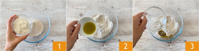 Pour préparer chez vous la rustichella intégrale, versez dans un bol la farine intégrale, la farine 0 1, l'huile d'olive extra vierge 2 et la levure instantanée 3.