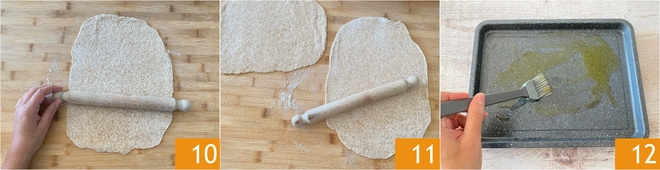 Étalez les pâtons avec un rouleau à pâtisserie 10 pour obtenir deux feuilles d'une épaisseur de 0,5 cm 11. Huilez un moule rectangulaire d'environ 23x35 cm 12.