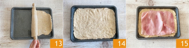 Déposez la première base intégrale en l'enroulant autour du rouleau à pâtisserie 13 14. Garnissez la rustichella avec les tranches de jambon cuit 15.
