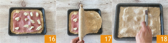 Ajoutez aussi le stracchino en vous aidant de deux cuillères à café 16. Recouvrez avec la seconde base intégrale 17 et scellez bien les bords. Avec une roulette, faites des incisions sur la surface à la fois horizontales et verticales 18.
