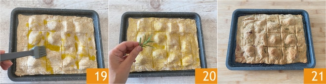Huilez la surface 19 et ajoutez le romarin frais 20. Faites cuire la rustichella intégrale dans un four préchauffé, en mode statique, à 180° pendant 30 minutes. Sortez-la du four 21, coupez-la en carrés et dégustez-la chaude.