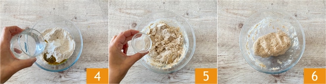 Versez l'eau chaude 4 et mélangez avec une cuillère en bois juste pour absorber les liquides. Ajoutez aussi le sel 5 et commencez à pétrir avec le bout des doigts jusqu'à obtenir une pâte homogène 6.