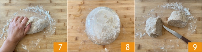 Transférez la pâte de la rustichella sur un plan de travail légèrement fariné 7 et pétrissez jusqu'à obtenir une boule souple et élastique. Couvrez-la avec son bol 8 et laissez-la reposer pendant 10 minutes. Coupez la boule en deux morceaux de même poids 9.