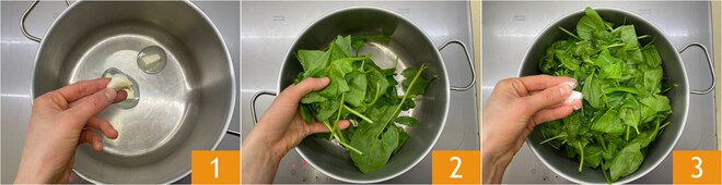 Pour préparer le rustico ricotta et épinards, commencez par mettre dans une casserole le beurre et l'ail 1. Lorsque le beurre est fondu, ajoutez les épinards 2 et assaisonnez de sel 3.
