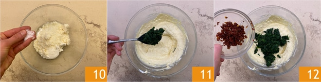 Assaisonnez de sel 10 et mélangez pour obtenir une préparation homogène. Ajoutez les épinards 11 et les tomates séchées 12.