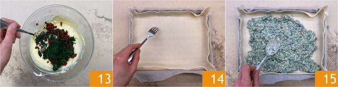 Mélangez bien 13 pour amalgamer tous les ingrédients. Disposez la pâte feuilletée, avec son papier sulfurisé, à l'intérieur d'un moule de 30x23 cm, de manière à ce qu'elle adhère bien au fond et aux bords. Piquez le fond avec les dents d'une fourchette 14. Ajoutez la farce et nivelez 15.