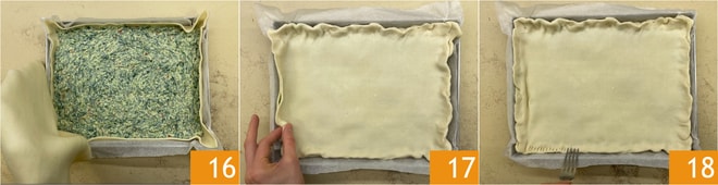 Couvrez avec un autre rouleau de pâte feuilletée 16 et rabattez les bords vers l'extérieur 17, puis scellez-les avec les dents d'une fourchette 18.