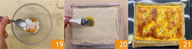 Dans un petit bol, battez le jaune d'œuf avec une cuillère à soupe de lait 19 et badigeonnez le rustico avec ce mélange 20. Faites des incisions sur la surface pour créer une évacuation pour la vapeur qui se formera à la cuisson. Faites cuire dans un four statique à 200°C pendant 25-30 minutes. Votre rustico ricotta et épinards est prêt à être dégusté 21.