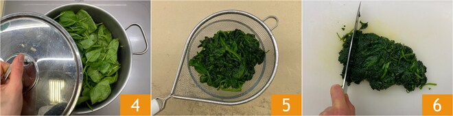 Couvrez avec le couvercle 4 et faites cuire à feu doux pendant 5 minutes. Laissez tiédir sur une passoire et pressez les épinards 5, puis hachez-les au couteau 6.