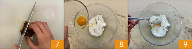 Hachez également les tomates séchées 7. Dans un bol, mettez la ricotta, ajoutez l'œuf 8 et le Grana 9.