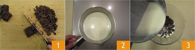 Pour préparer la Sacher à la cuillère, commencez par la ganache. Hachez le chocolat noir 1 et transférez-le dans un bol. Chauffez la crème jusqu'à frémissement 2 et versez-la en 3 fois dans le bol avec le chocolat 3.