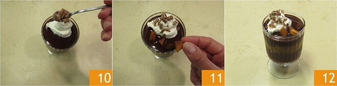 Décorez avec des copeaux de chocolat 10, des morceaux d'abricots séchés 11 et servez vos verrines 12.