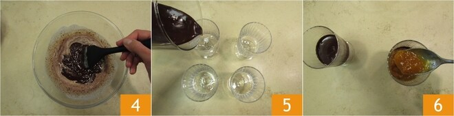 Mélangez à chaque fois avec une spatule pour bien faire fondre le chocolat 4, jusqu'à obtenir une ganache lisse et fluide. Prenez maintenant 4 verrines de 200 ml. Versez à l'intérieur deux doigts de ganache 5. Transférez au réfrigérateur pendant environ 15-20 minutes, en gardant la ganache restante à température ambiante pour éviter qu'elle ne se solidifie. Maintenant, reprenez les verrines et versez à l'intérieur de chacune environ 60 g de confiture d'abricots 6.