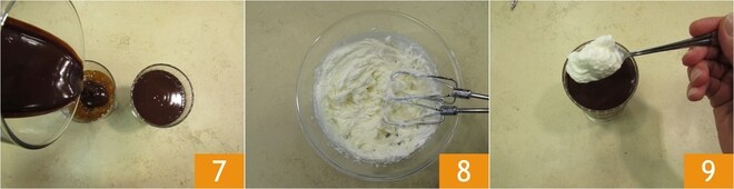Versez le reste de la ganache dans les verrines et transférez à nouveau au réfrigérateur pendant encore environ 15 minutes. Pendant ce temps, montez la crème en la laissant assez souple, elle doit être semi-montée 8. Transférez-la dans les verrines 9.